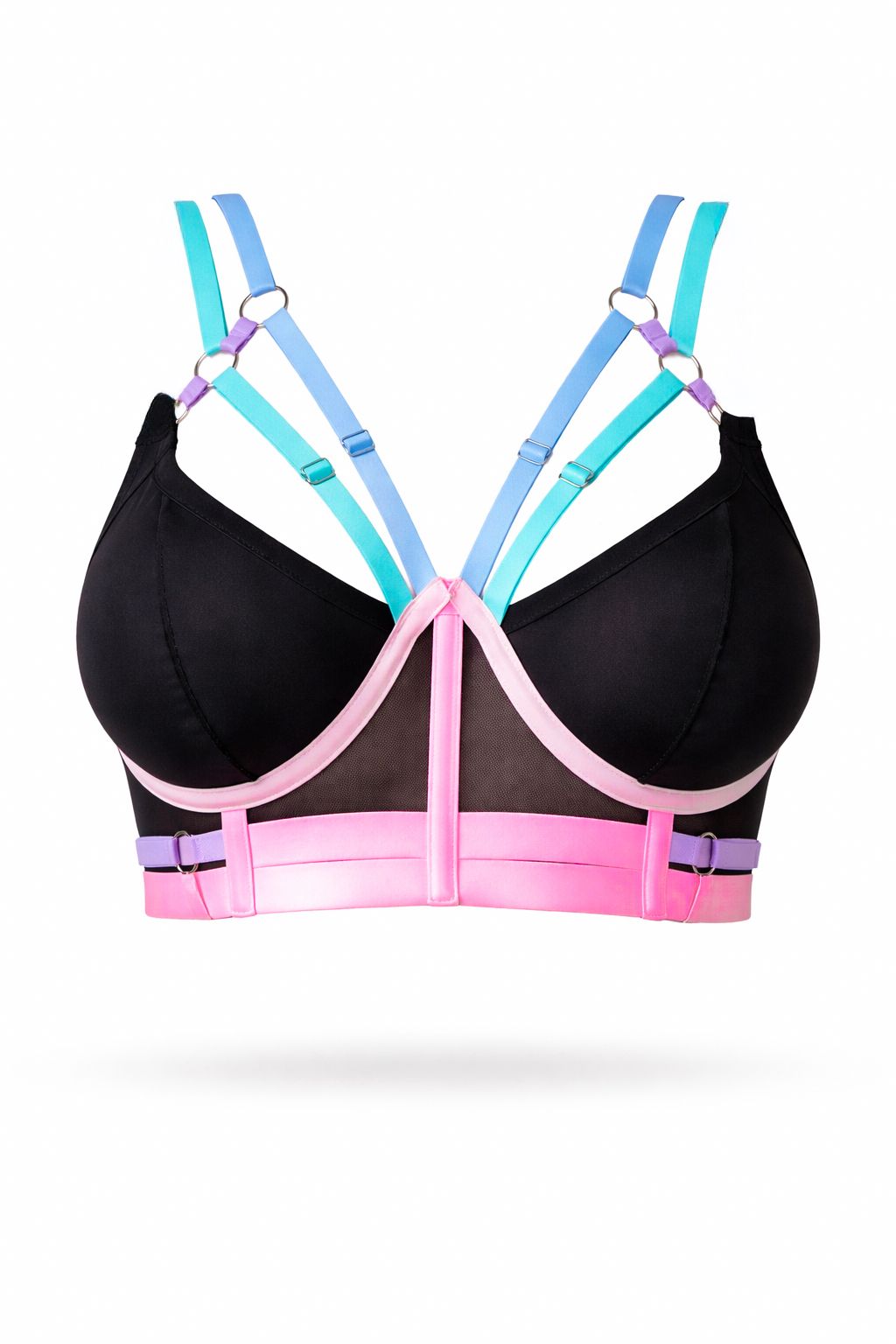Bustier estructurado con copas negras lisas y panel central de malla negra translúcida, que deja ver sutilmente la piel y aporta ligereza visual. Desde el escote nacen múltiples tiras elásticas en tonos pastel —celeste, turquesa y lila— que se conectan mediante argollas metálicas, formando un diseño tipo arnés que enmarca el busto.