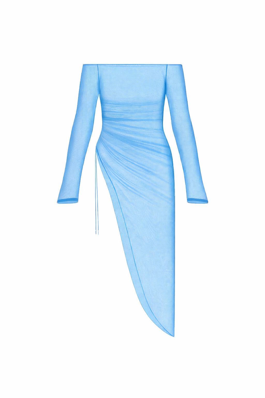 El vestido off shoulder en tul negro translúcido envuelve el cuerpo como una segunda piel, dejando ver la forma sin ocultarla. Las mangas largas y el escote recto aportan equilibrio, mientras la caída ligera del tejido genera movimiento y una sensación etérea.