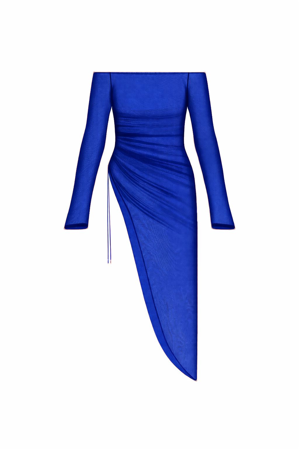 El drapeado lateral con ajuste crea una apertura asimétrica que revela la pierna y estiliza la figura, transformando la prenda en una composición dinámica entre estructura y fluidez. La transparencia, lejos de ser excesiva, está medida con precisión para jugar entre lo sugerido y lo evidente.