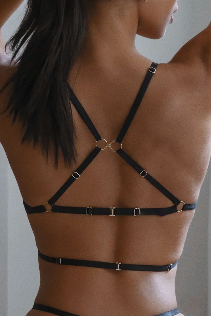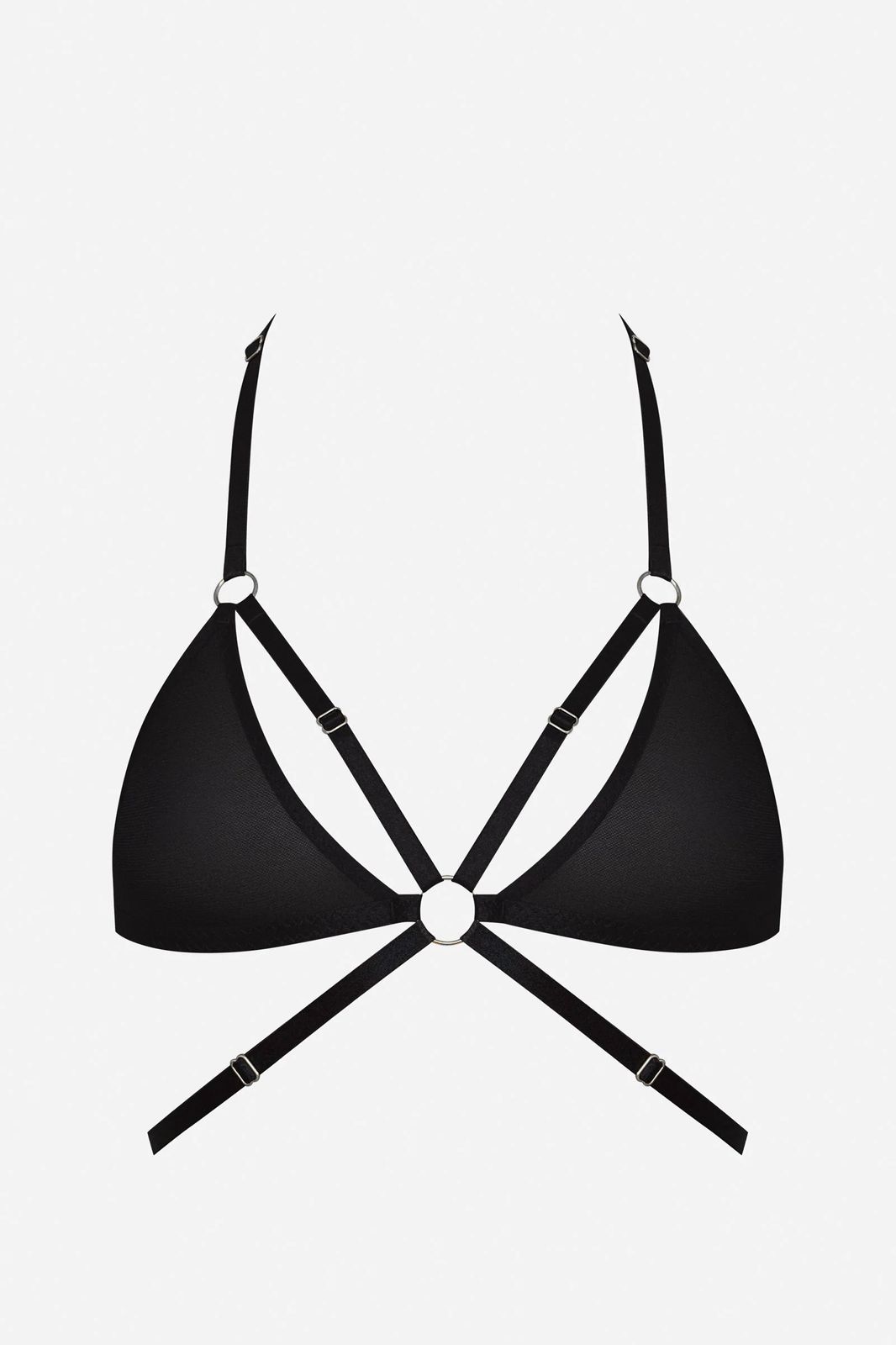 Sostén tipo arnés de líneas limpias y estética minimalista, construido en base a triángulos suaves de tela negra lisa. La estructura se articula desde un aro central metálico dorado, desde donde nacen múltiples tiras elásticas que envuelven el torso generando una geometría marcada pero ligera.
