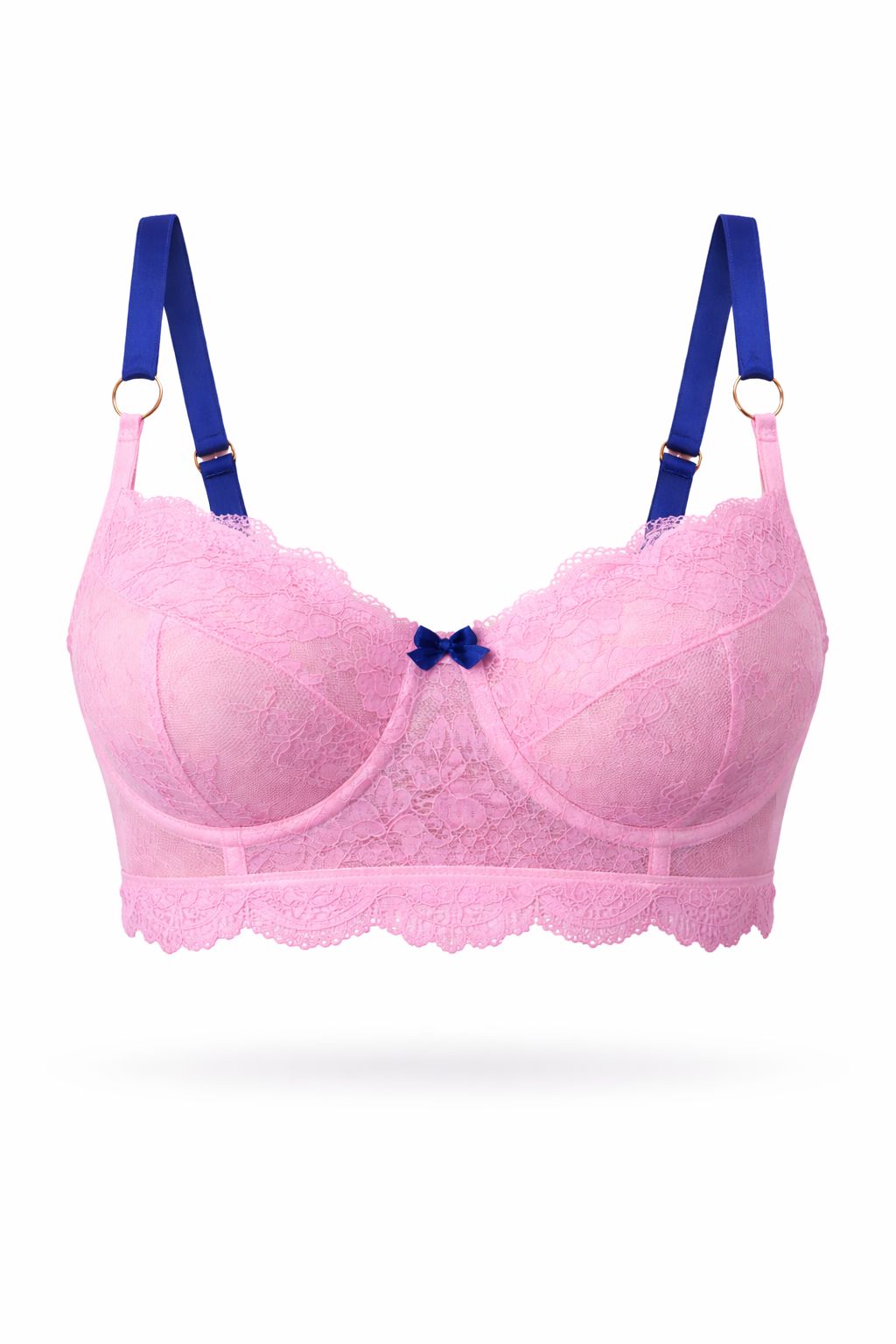 Las copas están confeccionadas en encaje floral rosado con base de malla, generando una textura rica pero ligera visualmente. El diseño incluye aro y cortes de confección que moldean y elevan el busto, manteniendo una forma definida.