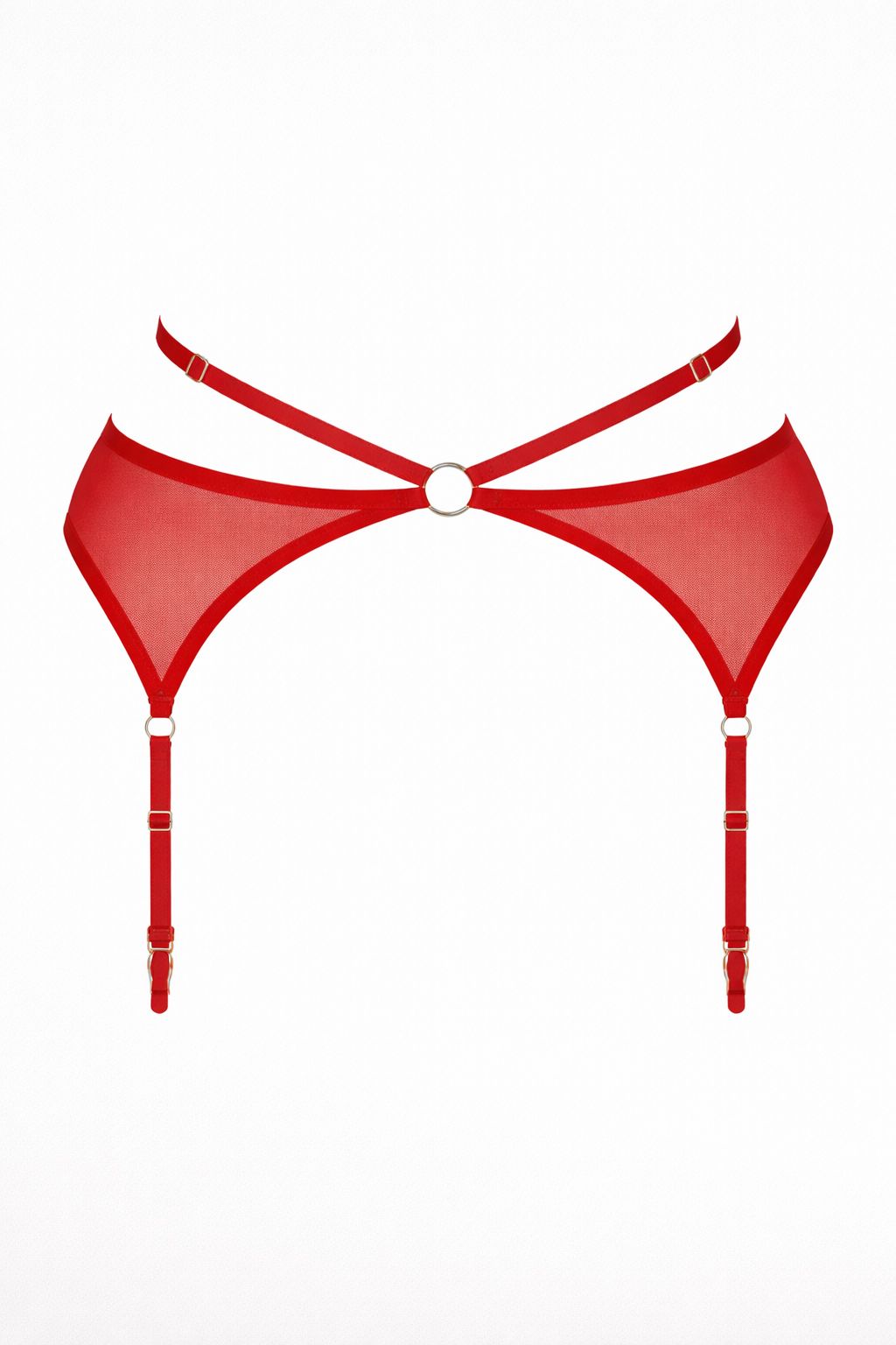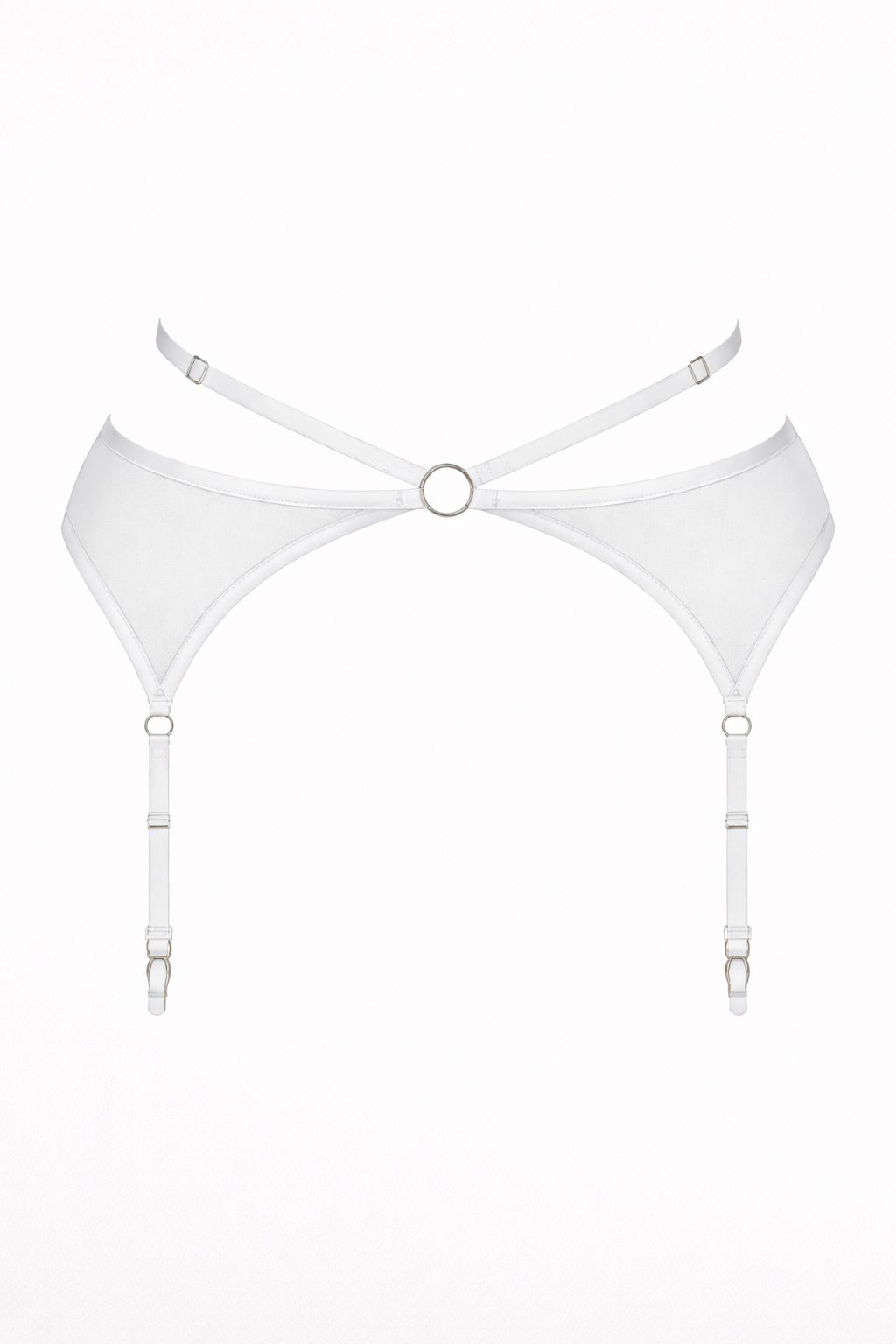 La base en malla translúcida suaviza la estructura, mientras las tiras elásticas delimitan y fragmentan la silueta, generando un juego entre contención y vacío. Las ligas descienden desde la cadera hacia la pierna, prolongando la composición y alargando visualmente el cuerpo.