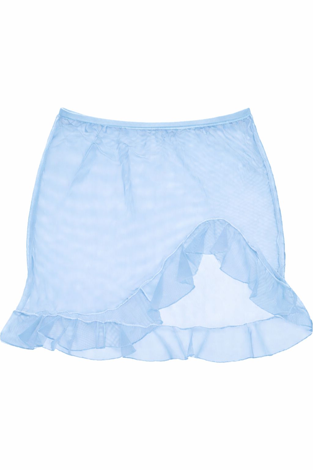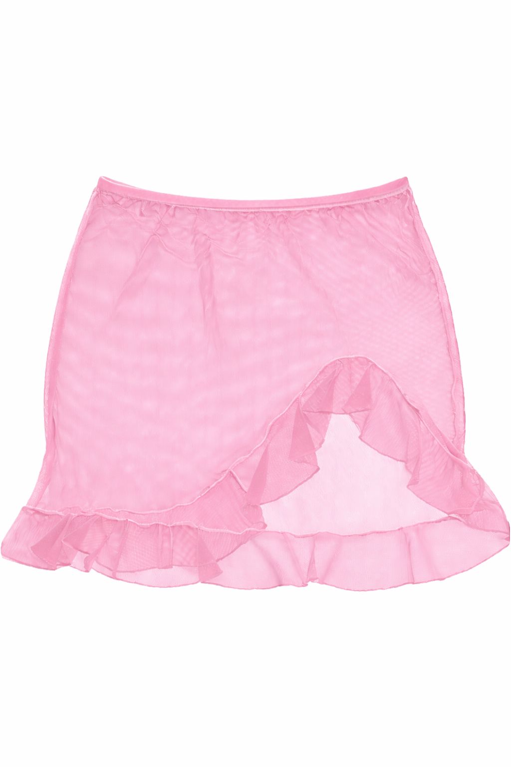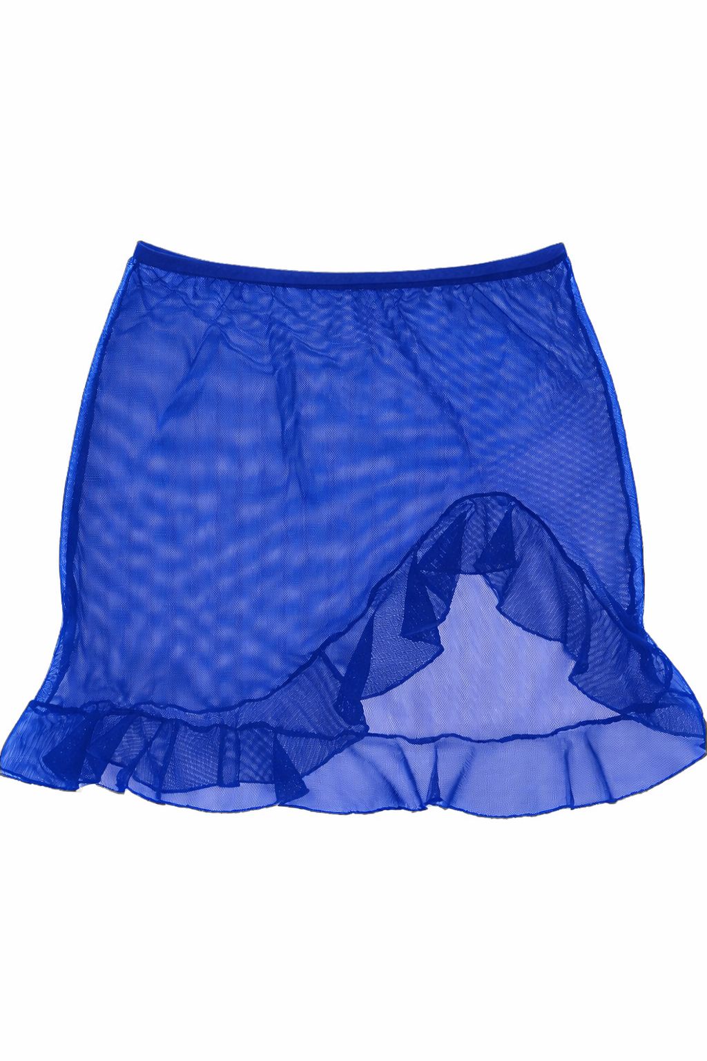Falda corta de malla transparente en tono negro, con caída ligera y textura suave que se adapta al cuerpo sin rigidizar la silueta. Presenta un diseño asimétrico con abertura lateral que deja entrever la piel, aportando movimiento y un aire sutilmente provocador.