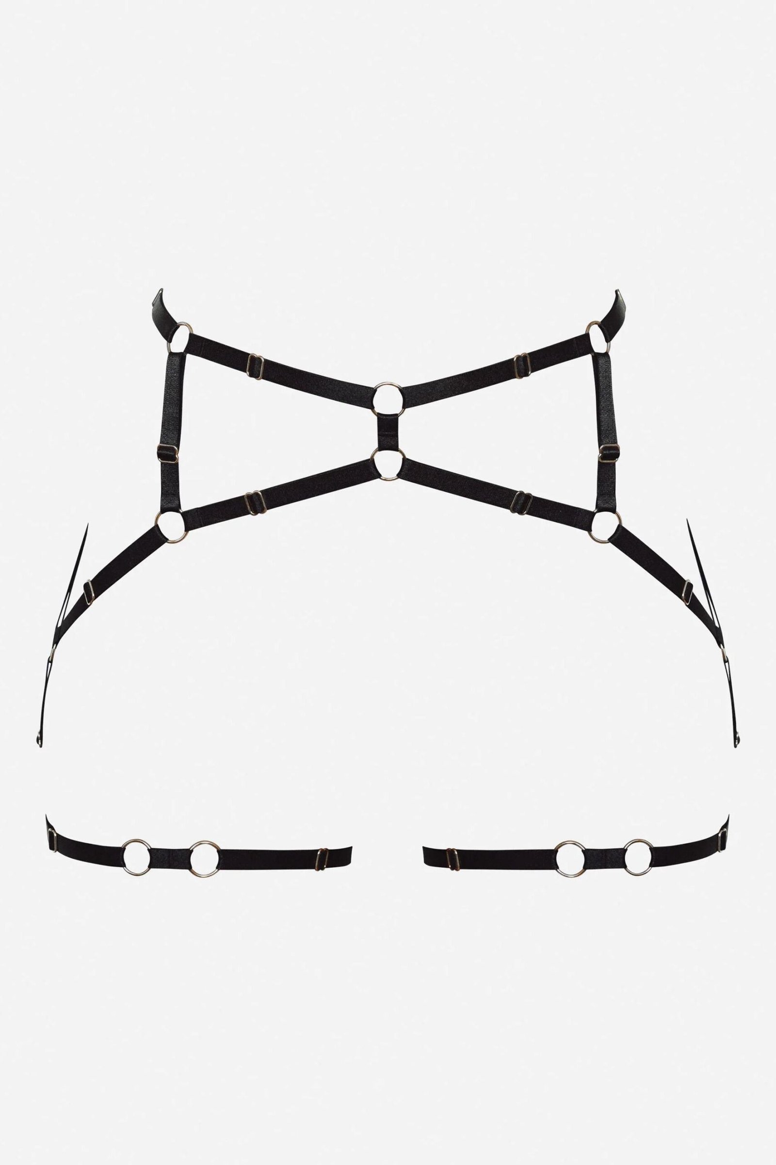 Arnés corporal de líneas precisas que redefine la silueta desde la tensión y el vacío. Construido en elásticos satinados de alta resistencia, se articula desde un aro central metálico que organiza la geometría en cruz sobre la cadera y la espalda. Cada tira es regulable, permitiendo un ajuste milimétrico que abraza el cuerpo sin perder firmeza. Los herrajes dorados aportan contraste y elevan la pieza hacia un lenguaje más joya que prenda.
