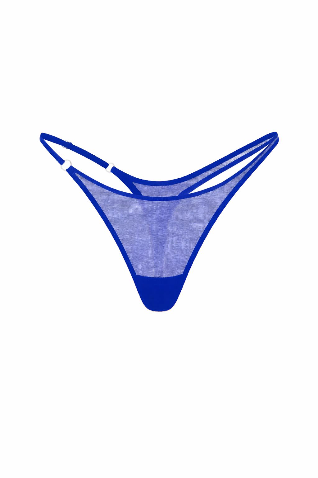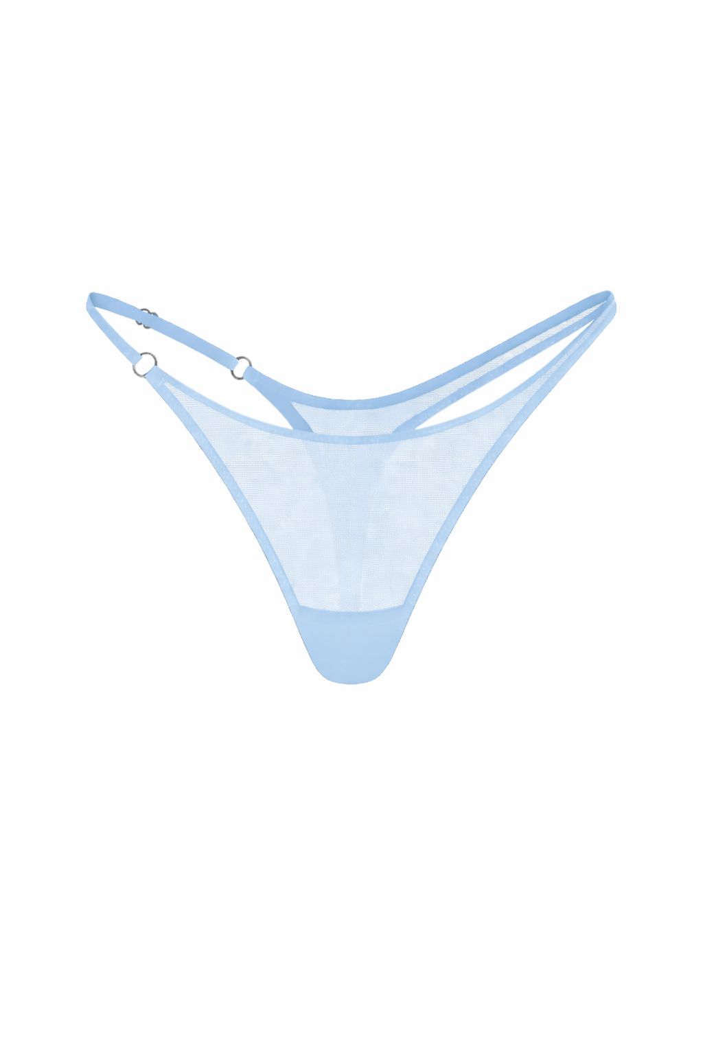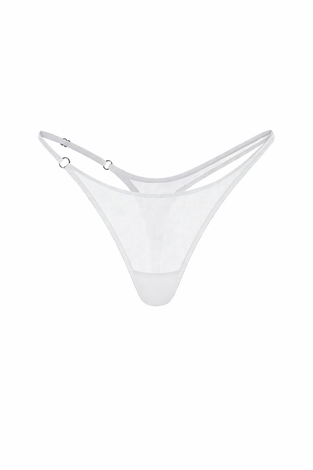 El colaless en tul translúcido mantiene un panel frontal limpio que deja ver la piel, mientras las líneas laterales rompen la simetría tradicional. Un lado incorpora una tira regulable que permite ajustar y tensionar la silueta, mientras el otro se mantiene fijo, generando un contraste sutil pero evidente.