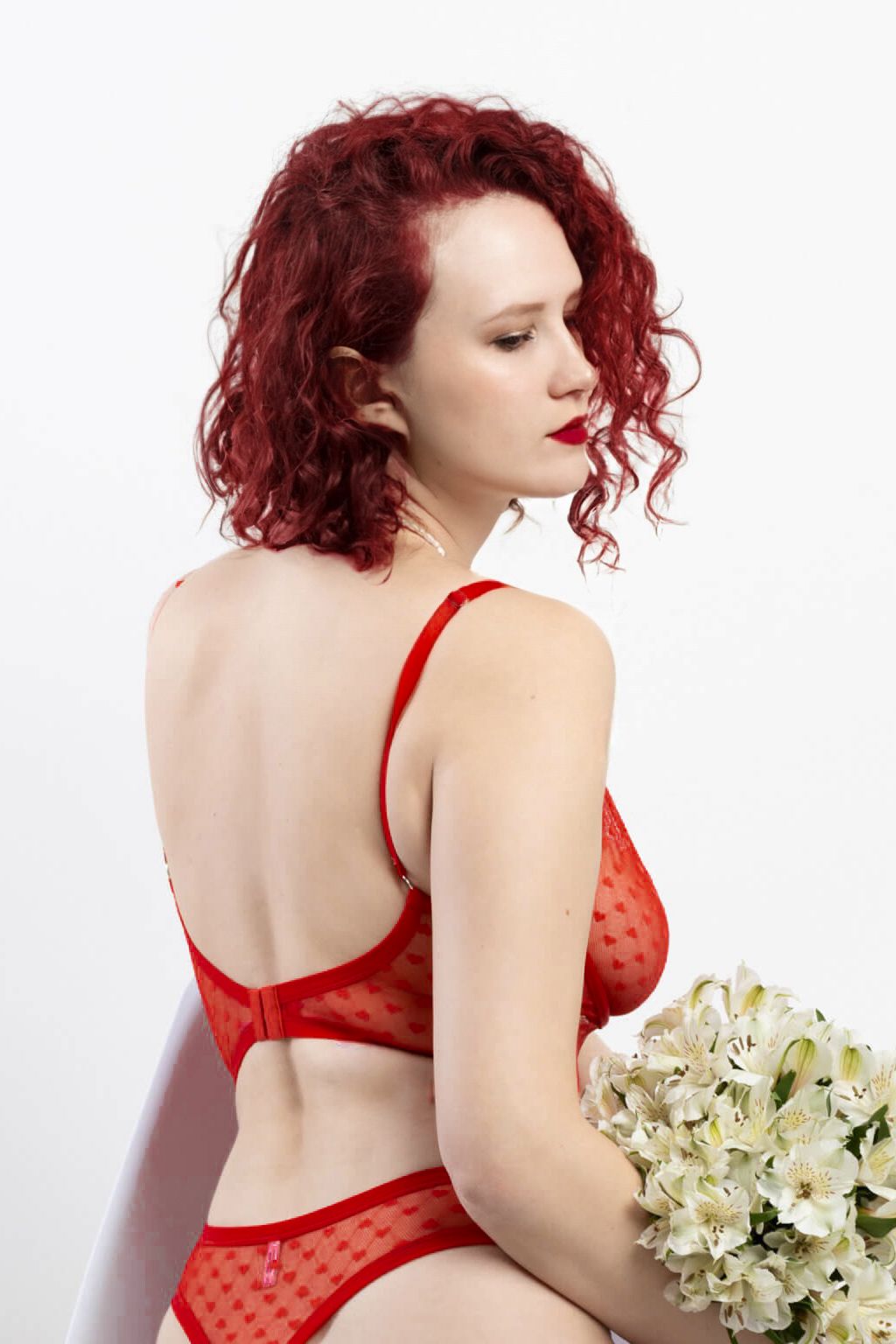 La parte inferior es una tanga de malla elasticada, de acabado suave y ligero sobre la piel. Su diseño minimalista y semi translúcido se adapta al cuerpo sin marcar, aportando una sensación de segunda piel con un enfoque sensual y contemporáneo.