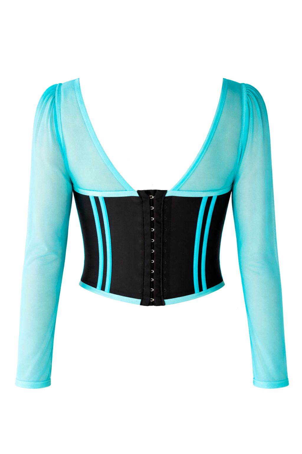 Las copas están trabajadas en lycra Dupont doble, aportando soporte, suavidad y una terminación limpia que realza la forma natural. Las mangas, en malla elasticada translúcida, equilibran la estructura con ligereza, adaptándose al movimiento.