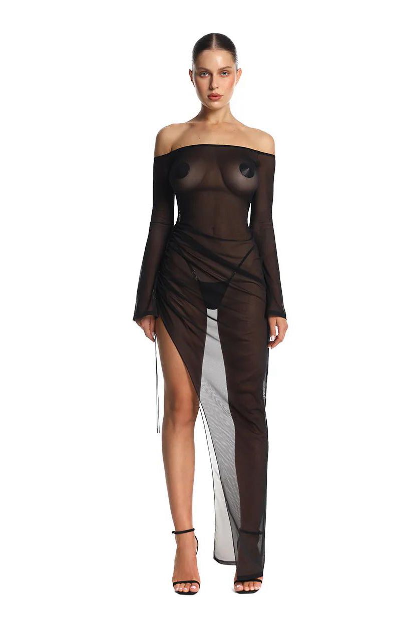 El vestido off shoulder en tul negro translúcido envuelve el cuerpo como una segunda piel, dejando ver la forma sin ocultarla. Las mangas largas y el escote recto aportan equilibrio, mientras la caída ligera del tejido genera movimiento y una sensación etérea.