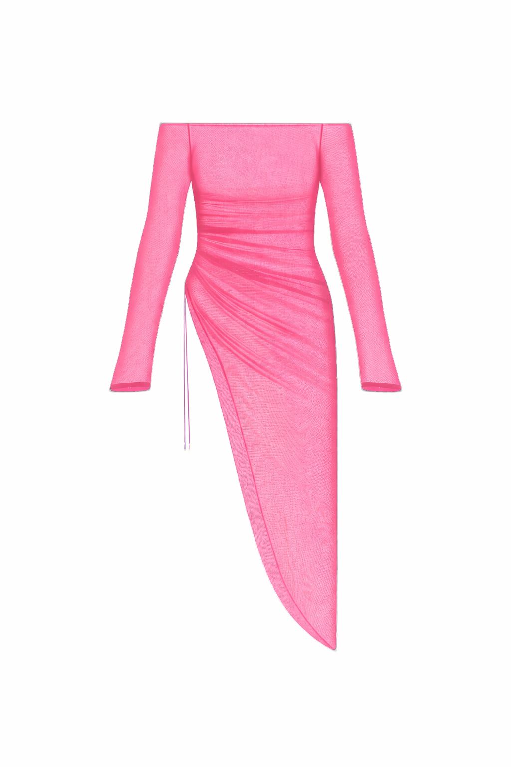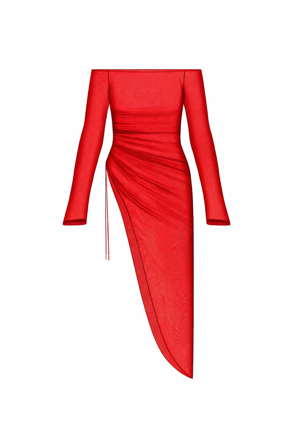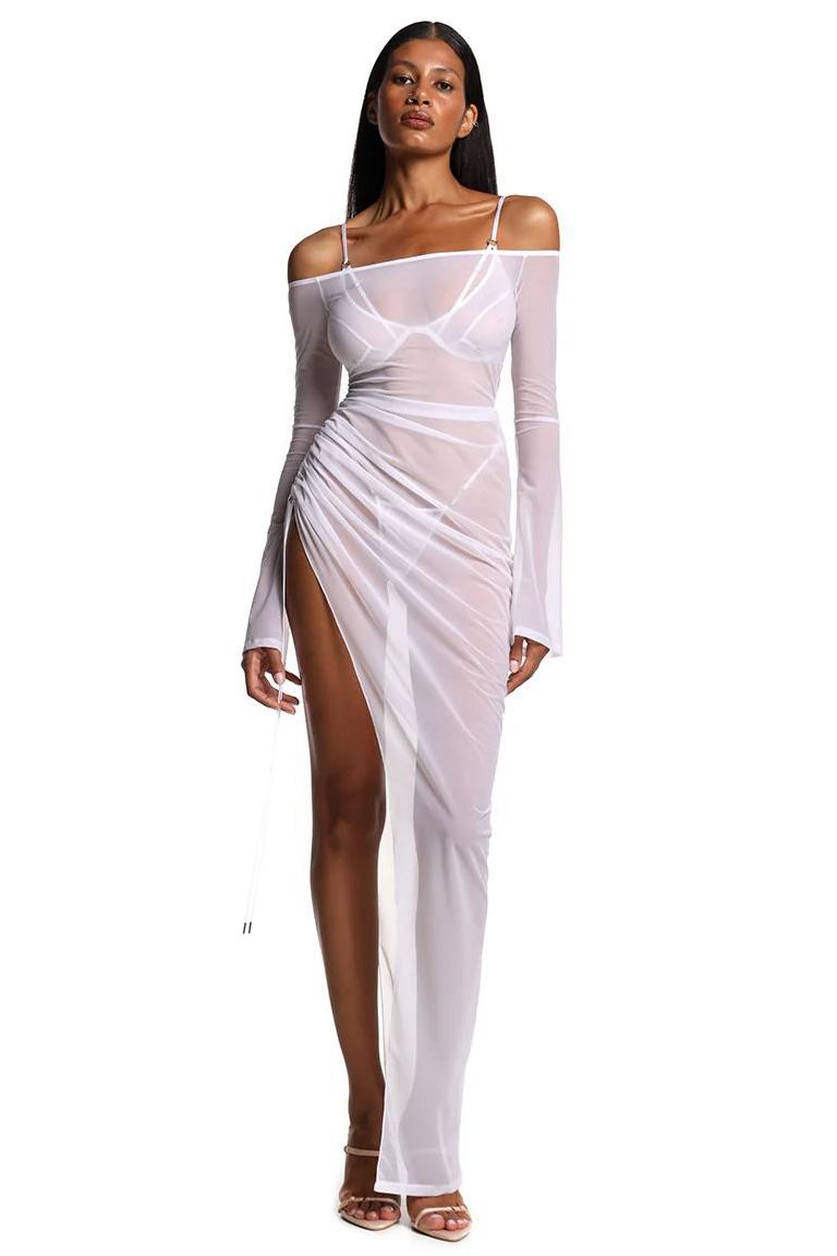 El drapeado lateral con ajuste crea una apertura asimétrica que revela la pierna y estiliza la figura, transformando la prenda en una composición dinámica entre estructura y fluidez. La transparencia, lejos de ser excesiva, está medida con precisión para jugar entre lo sugerido y lo evidente.