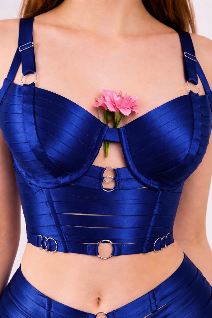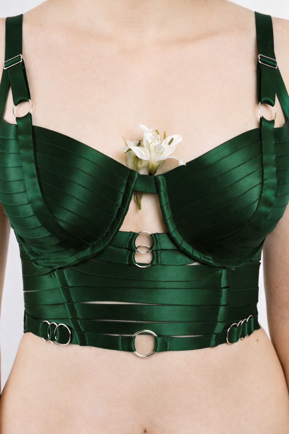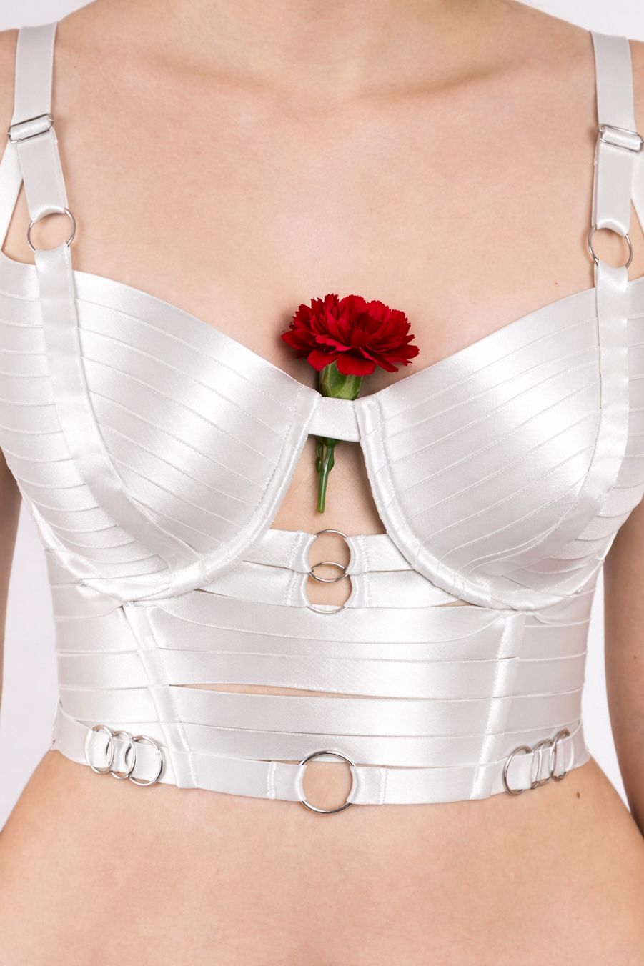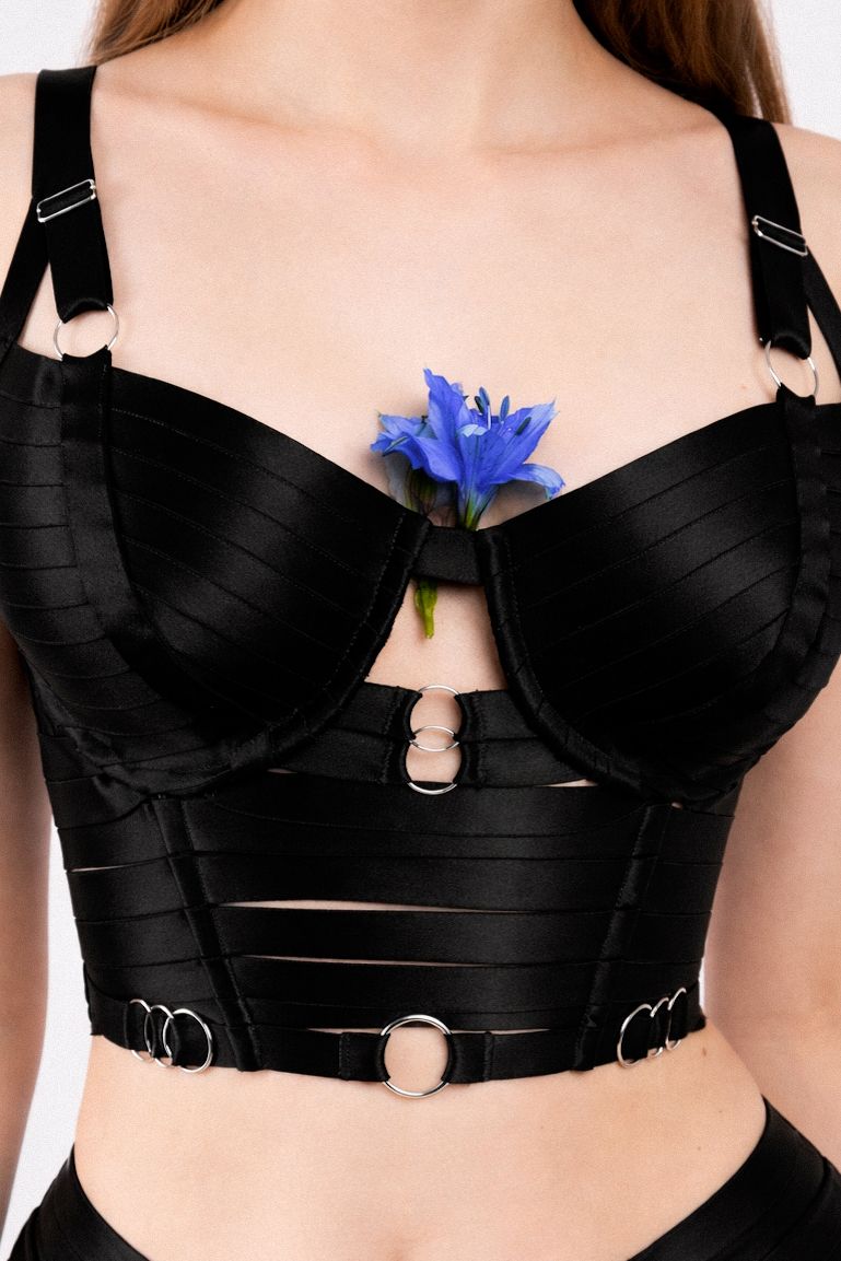 El sostén en satén  se desarrolla a partir de copas firmes que contienen y proyectan el busto, mientras una red de tiras paralelas recorre el torso generando una composición envolvente y controlada. Cada línea está pensada para dirigir la mirada y esculpir la silueta con intención.