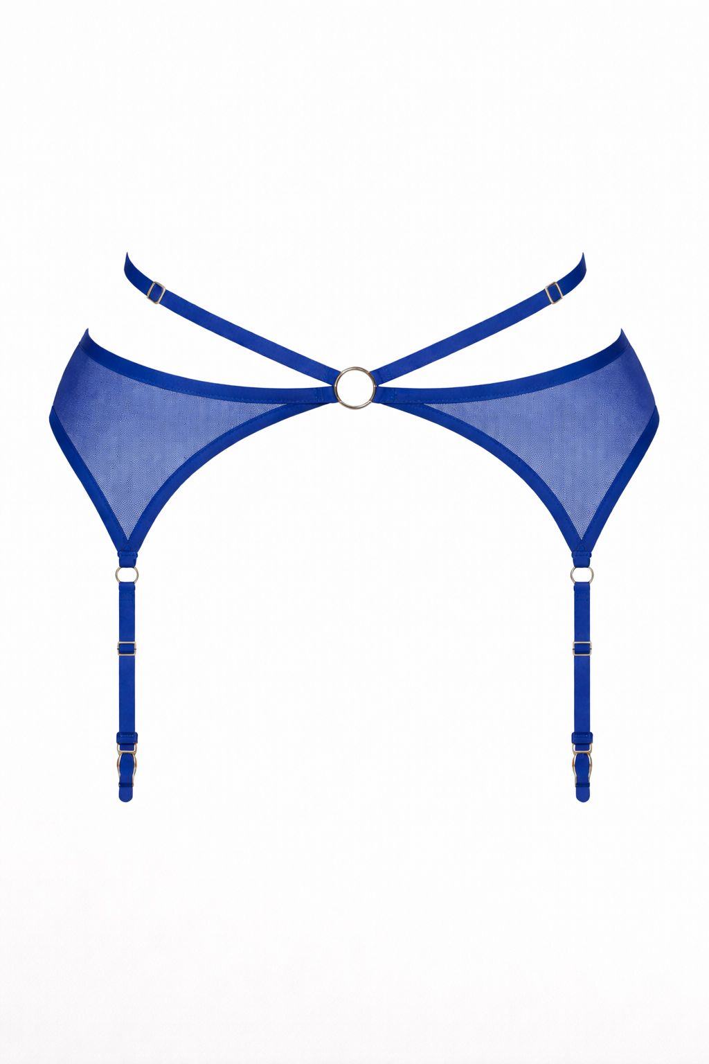 La base en malla translúcida suaviza la estructura, mientras las tiras elásticas delimitan y fragmentan la silueta, generando un juego entre contención y vacío. Las ligas descienden desde la cadera hacia la pierna, prolongando la composición y alargando visualmente el cuerpo.