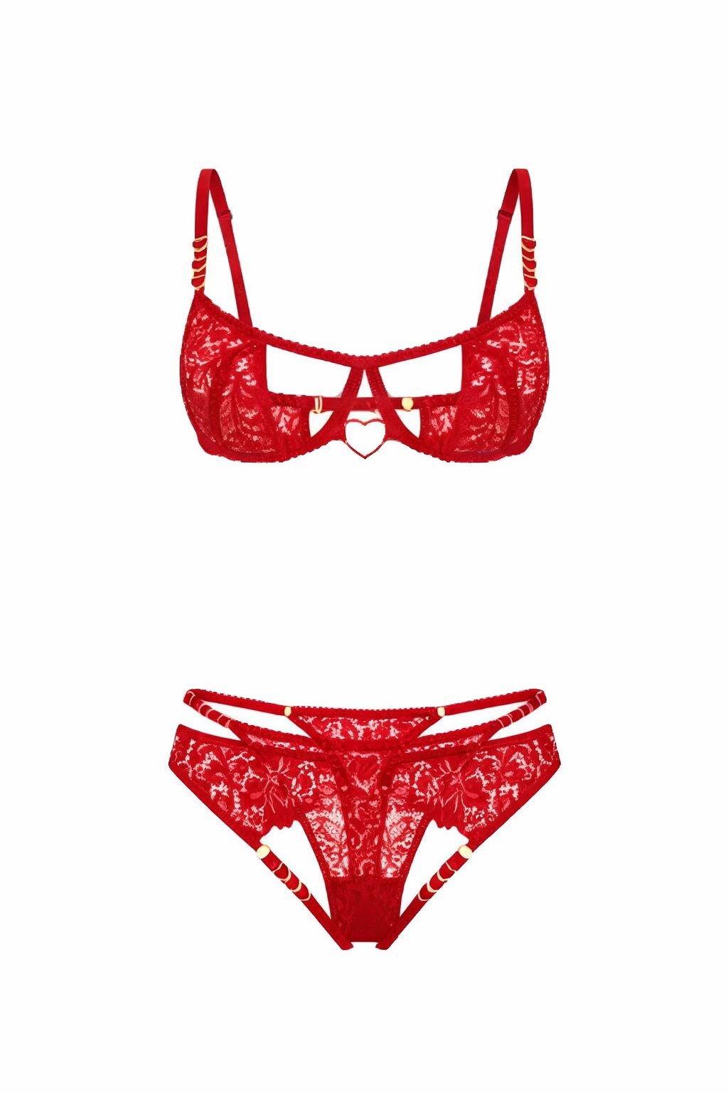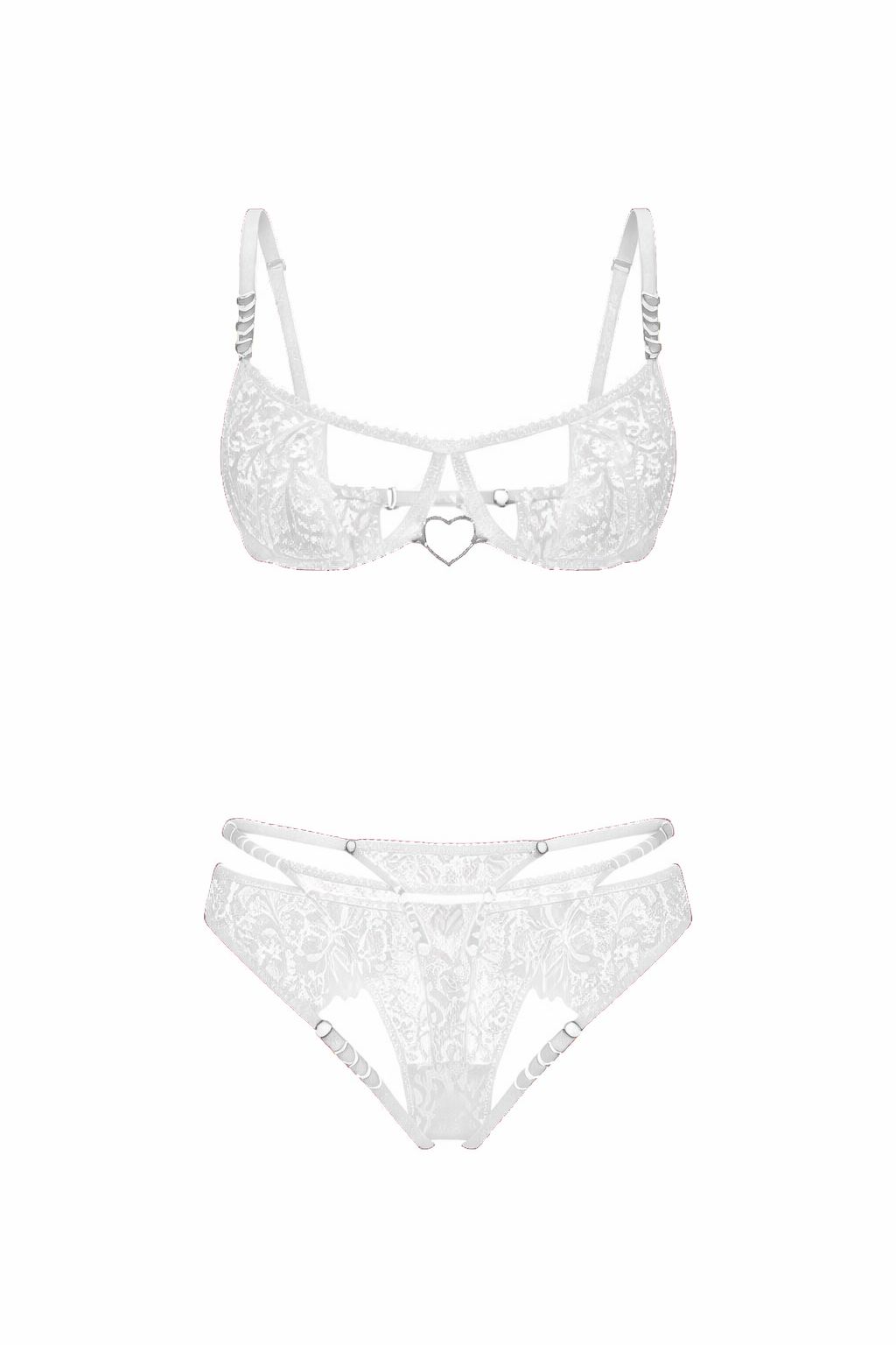 El sostén abierto con aro, construido en encaje floral translúcido, se conecta a través de finas tiras y herrajes metálicos que aportan tensión visual y equilibrio. Su diseño realza el busto sin ocultarlo, jugando entre lo sutil y lo provocador con precisión.