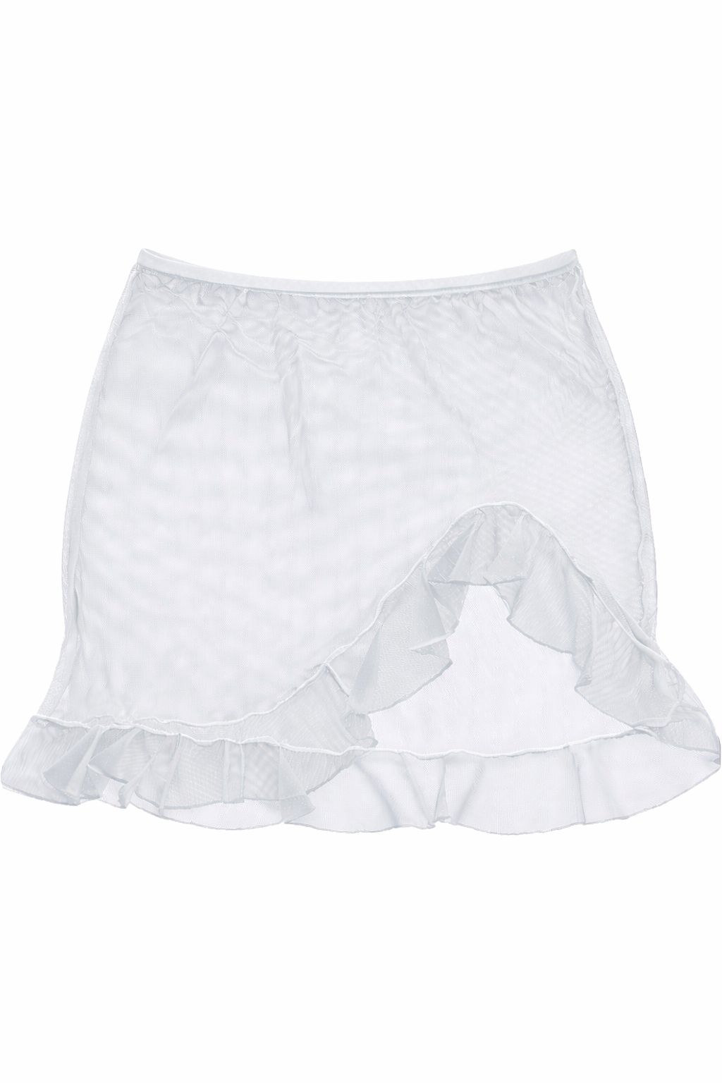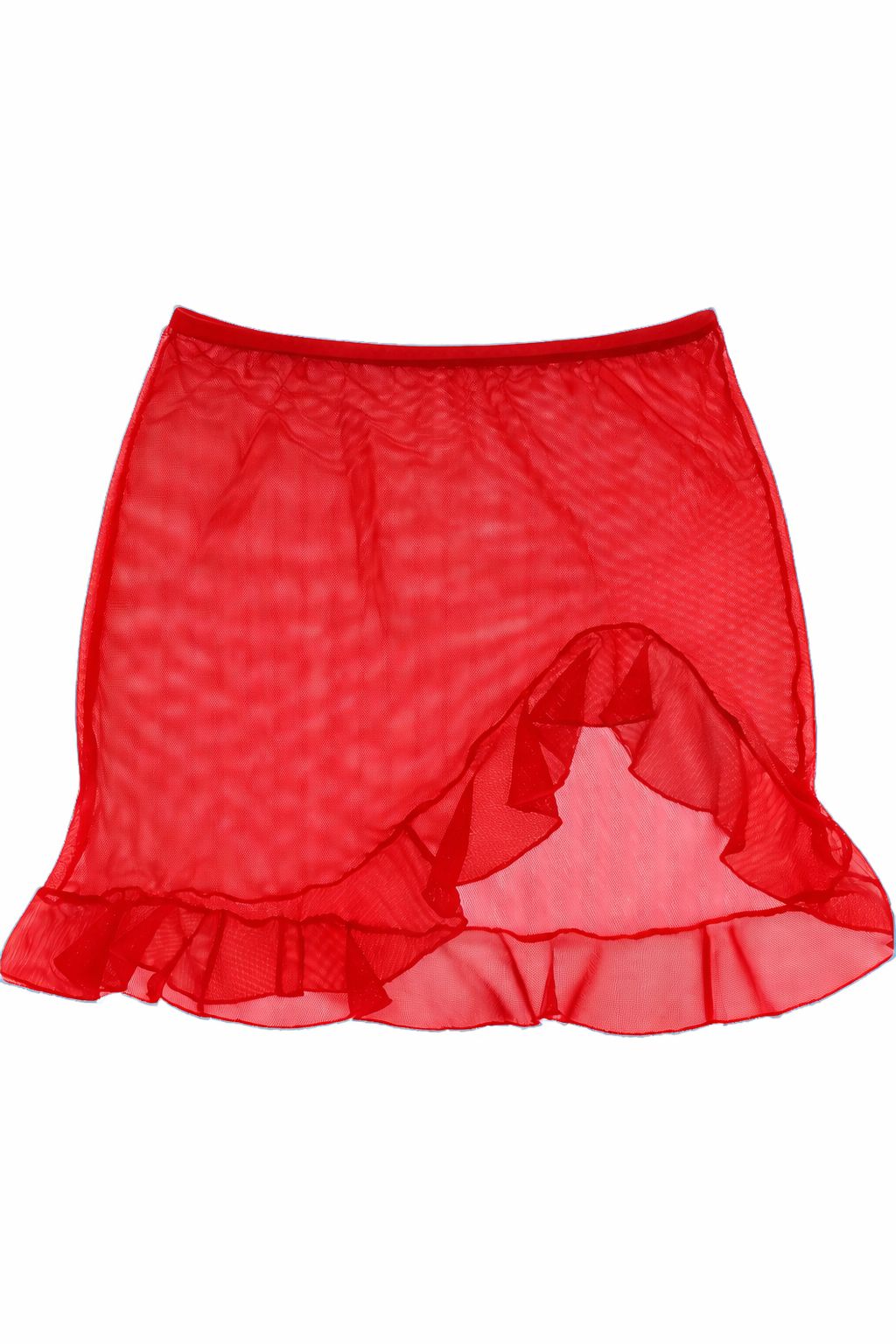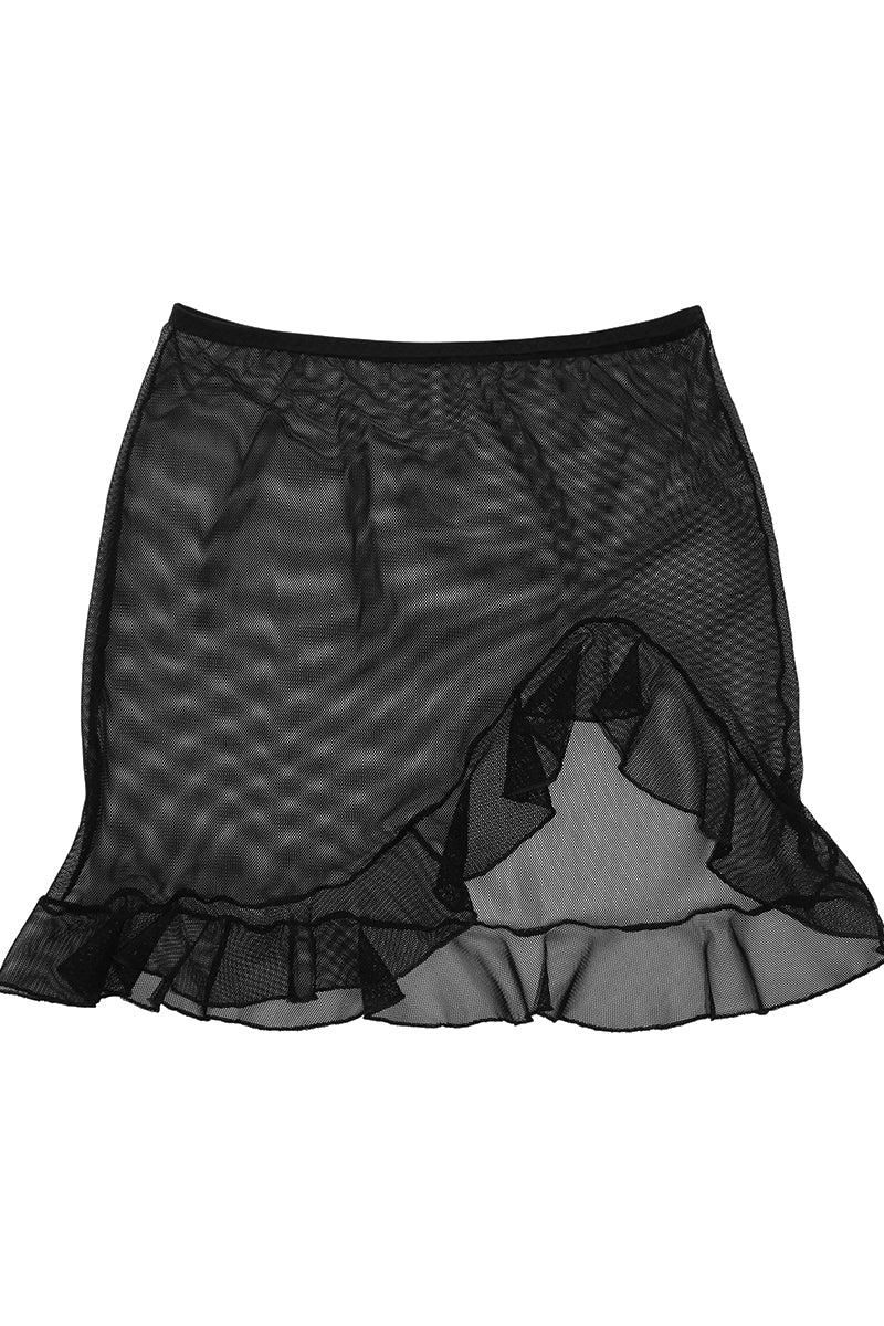 Falda corta de malla transparente en tono negro, con caída ligera y textura suave que se adapta al cuerpo sin rigidizar la silueta. Presenta un diseño asimétrico con abertura lateral que deja entrever la piel, aportando movimiento y un aire sutilmente provocador.