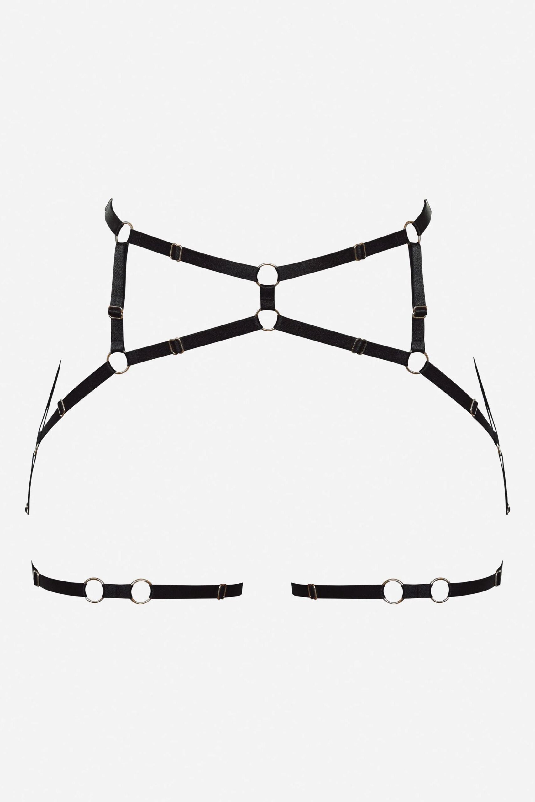 Arnés corporal de líneas precisas que redefine la silueta desde la tensión y el vacío. Construido en elásticos satinados de alta resistencia, se articula desde un aro central metálico que organiza la geometría en cruz sobre la cadera y la espalda. Cada tira es regulable, permitiendo un ajuste milimétrico que abraza el cuerpo sin perder firmeza. Los herrajes dorados aportan contraste y elevan la pieza hacia un lenguaje más joya que prenda.