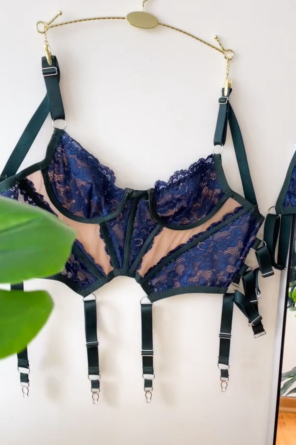 Bustier de encaje en tono azul profundo con estructura de corsetería y contraste en elásticos verde oscuro, que enmarca y define toda la pieza.