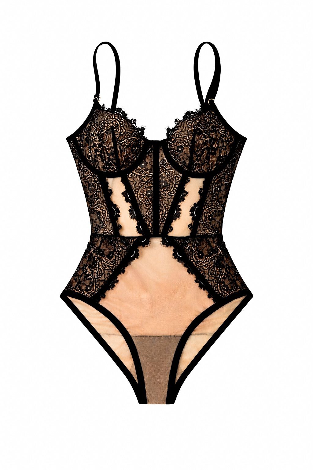 •⁠ ⁠Paneles laterales en encaje con transparencias estratégicas
